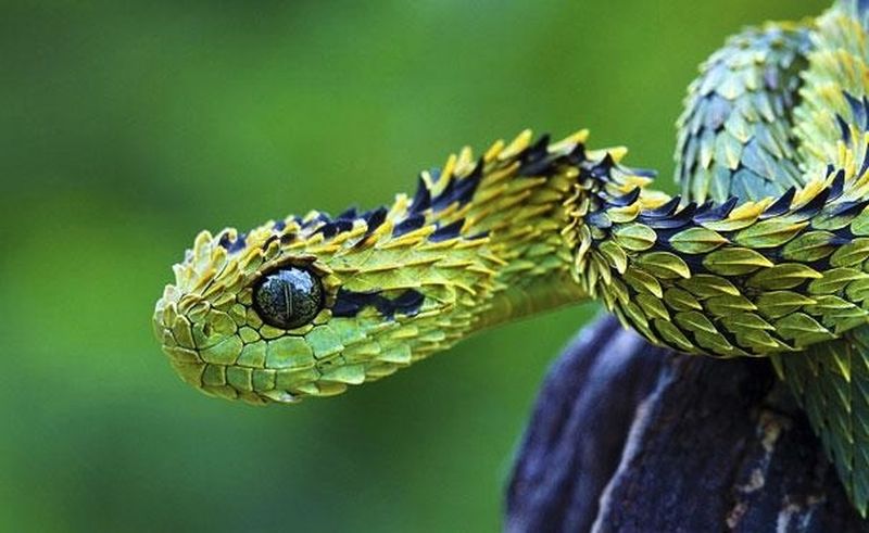 Эта ядовитая змея обитает на деревьях в тропических лесах Африки, прекрасно мимикрирует под кору и листья кустарников.