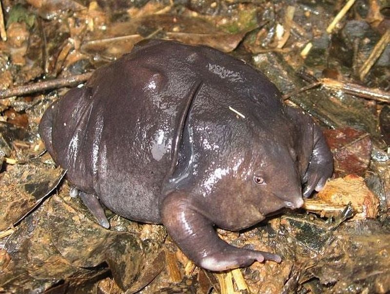 Помимо странного пунцового цвета и раздутого оплывшего тела эта лягушка имеет нетипично заостренный нос-хоботок. Обитает под землей и выходит на поверхность раз в году на две недели.