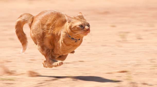 Документально было подтверждено, что домашние кошки могут развивать скорость в 48 км\ч. Таким образом, кошка бы выиграла забег даже у чемпиона мира.