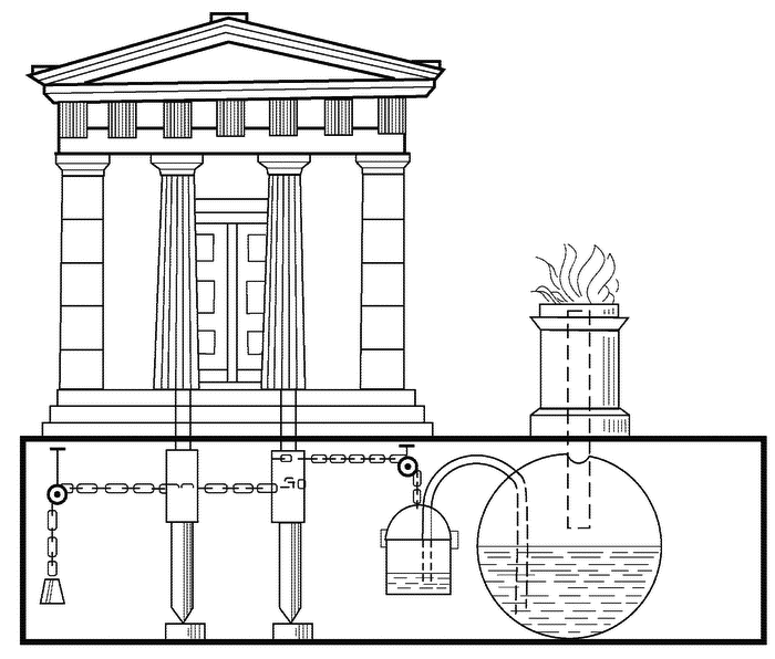 Герону Александрийскому приписывают разработку одной из самых ранних систем автоматических дверей, в первом веке нашей эры. Система уравновешенных, паровых весов открывала двери храма, когда жрецы проводили сожжение на алтаре.