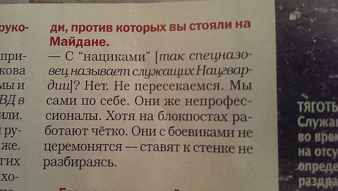 Журнал не раскрывает имя бойца внутренних войск, но поясняет, что его история интересна тем, что еще недавно в Киеве он стоял в кордоне, охранявшем подступы к правительственному кварталу, а теперь воюет на одной стороне со своими недавними противниками.