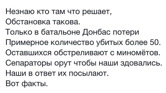 Командир батальона «Донбасс» Семен Семенченко написал в своем фейсбуке следующее: «Пытаются развести ребят на сдачу в плен, не поддаются. С одной стороны танковая дивизия, с другой - полк ВДВ. Хоть и враг, но кадровые лучше, чем ДНР. Раненым медицинскую помощь оказали. В течение часа должно всё решиться».
