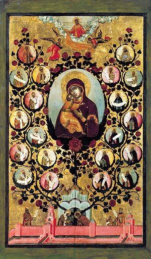 Икона "Владимирской Богоматери" изображает становление русской государственности, в равной мере как и библейский сюжет постройки Храма и помещение в него Ковчега означает становление государственности евреев. В библейском смысле сюжет иконы можно трактовать так: царь Соломон (Алексей Михайлович, изображенный внизу иконы) построил Храм (Успенский собор) и поместил в него Ковчег Завета (Владимирскую икону Богоматери). Кстати, историки предпочитают не задаваться вопросом – почему иконописец не изобразил на иконе Ивана III, якобы основавшего Собор и поместившего туда эту икону (по версии трад. истории), а увековечил Алексея Михайловича. На иконе, у подножия собора, также изображены князь Иван Калита, собиратель русских земель, и митрополит Петр, духовный основатель храма. Они сажают древо русского государства. На ветвях его размещены медальоны с портретами всех наиболее значительных политических деятелей Древней Руси. (Внизу, на Кремлевской стене, стоят царь Алексей Михайлович и царица Мария Ильинична с царевичами Алексеем и Федором.).