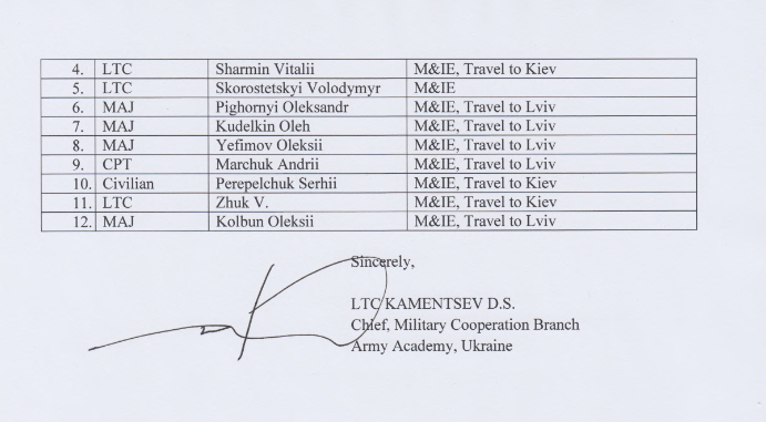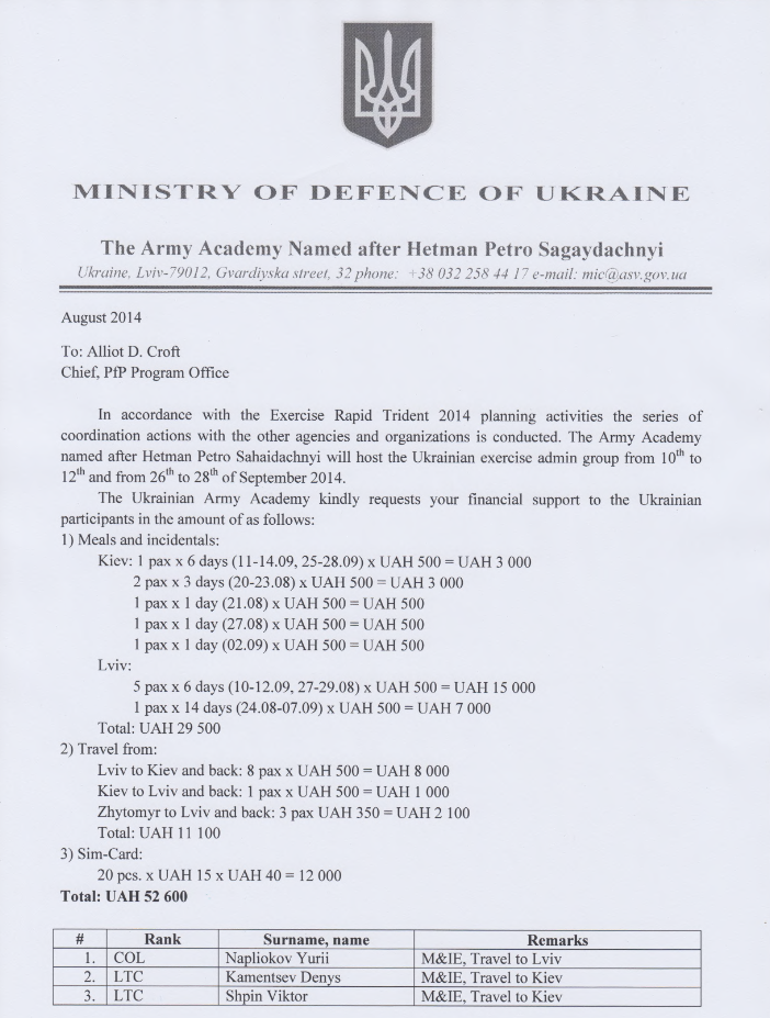 Один из самых удивительных документов. Командование Военно-морских сил нижайше просит заокеанских хозяев оплатить командировочные расходы украинских офицеров во время учений, проводимых Пентагоном на украинской же территории. А где же национальная гордость? К тому же зачем перечислять более полумиллиона гривен на карточный счет капитана 3-го ранга Дениса Ступака – объяснить невозможно. Разве что с целью использовать бесконтрольно, скрыть от налогов, лично обогатиться? Вероятно, украинским и американским журналистам будет интересно найти этого офицера и задать ему ряд вопросов.