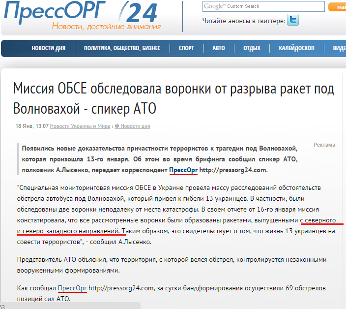 "Специальная мониторинговая миссия ОБСЕ в Украине провела массу расследований обстоятельств обстрела автобуса под Волновахой, который привел к гибели 13 украинцев. В частности, были обследованы две воронки неподалеку от места катастрофы. В своем отчете от 16-го января миссия констатировала, что все рассмотренные воронки были образованы ракетами, выпущенными с северного и северо-западного направлений. Таким образом, это свидетельствует о том, что жизнь 13 украинцев на совести террористов",