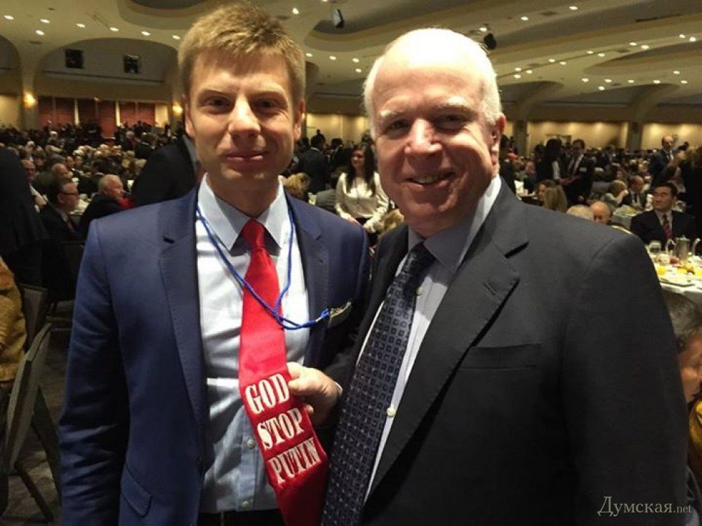 «Американский политик-республиканец был в восторге от моего небольшого перформанса — галстука с надписью «God stop Putin». Такие галстуки, кстати, попросили и многие другие участники собрания. Вообще Джон МакКейн поддержал нашу страну и пообещал, что будет настаивать на том, чтобы Барак Обама оказал поддержку Украине летальным оружием, в котором она нуждается для защиты. Такое содействие со стороны председателя Комитета по вооруженным силам Сената США дает надежду на то, что американский президент продемонстрирует дух решимости и предоставит нашей стране необходимую помощь», — отметил Гончаренко.