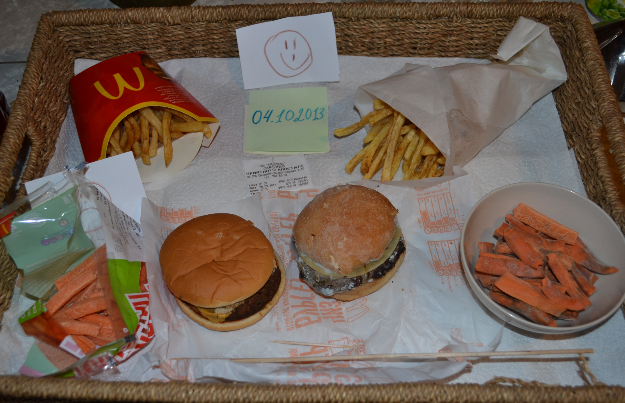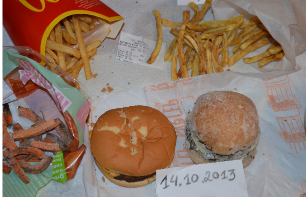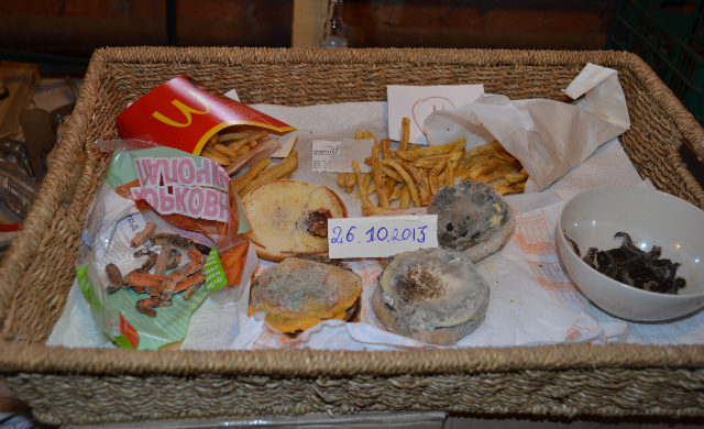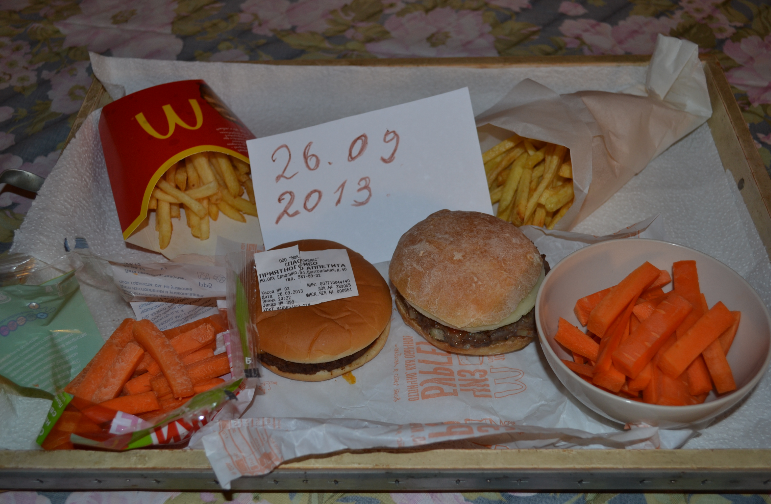 Идея была такая-в один день покупается в Макдачной чизбургер, морковные палочки и картошка и сами делаем тоже самое, от начала до конца. Свои булочки, котлета, морковка, картошка. Потом готовый прлдукт и макдачную хню помещаем в одинаковые условия.