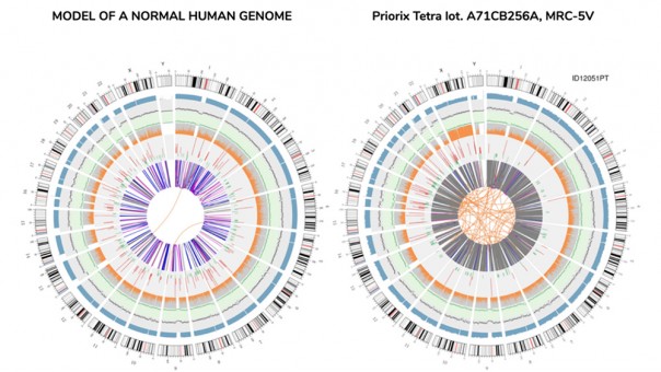 Геномная ДНК человека, содержащаяся в вакцине Priorix lot. n. A71CB256A является аномальным, представляя собой важные несоответствия по сравнению с типичным геномом человека, т. е. геном здорового человека. Существует несколько неизвестных вариантов (не отмеченных в общедоступных базах данных), и некоторые из них расположены в генах, участвующих в раке. Что также очевидно аномально, так это избыток генома, который показывает изменения в количестве копий (CNV) и структурных вариантах (SV), таких как транслокации, вставки, делеции, дупликации и инверсии, многие из которых включают гены.