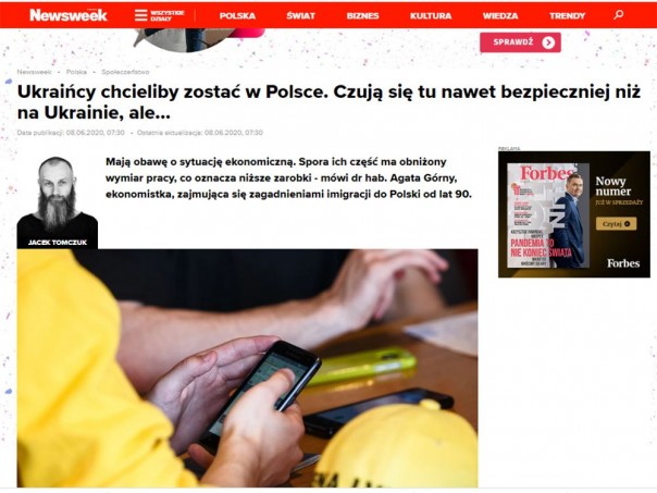 «Украинцы, работающие в Польше, хотели бы там остаться, несмотря на эпидемию коронавируса, потому что чувствуют себя безопаснее, чем на Украине. Однако тревогу у них вызывает экономическая ситуация. Многие работают неполный рабочий день, соответственно, меньше получая. В связи с этим растёт риск потерять работу, а затем и жильё», – рассказывает о жизни украинцев в Польше еженедельный общественно-политический журнал Newsweek Polska в интервью с экономистом, сотрудником Центра исследования миграции Агатой Гурны (Agata Górny).