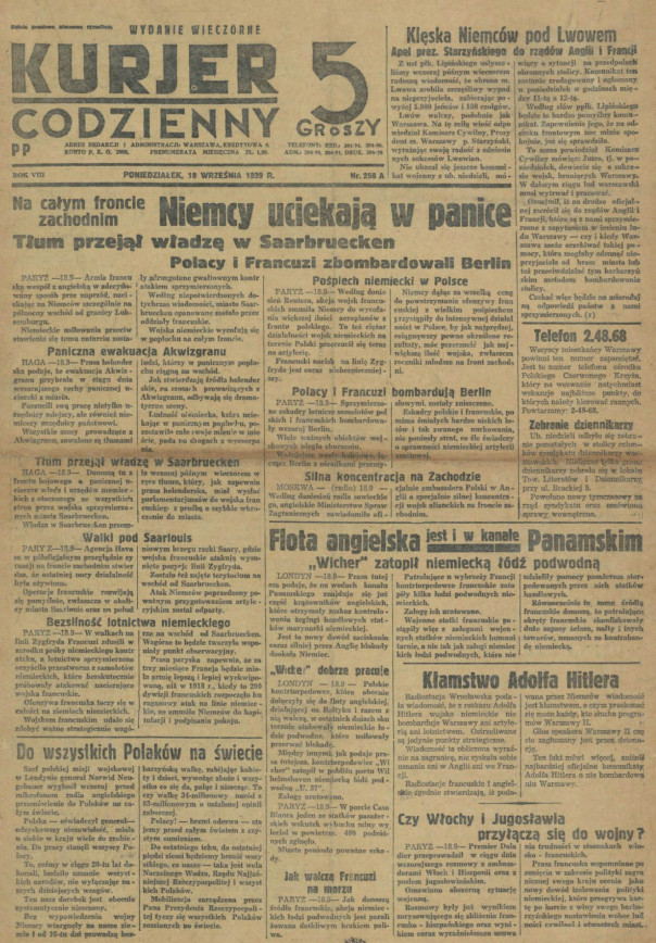 6 сентября 1939 года. Налет 30 польских бомобардировщиков на Берлин. Линия Зигфрида прорвана в 7 местах.Немецкие войска в панике разбегаются
