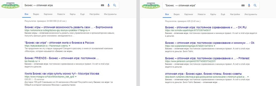Для поиска точной фразы или формы слова запрос нужно включить в кавычки — "Бизнес — отличная игра". Запрос в кавычках будет найден без изменений форм слова и синонимов.