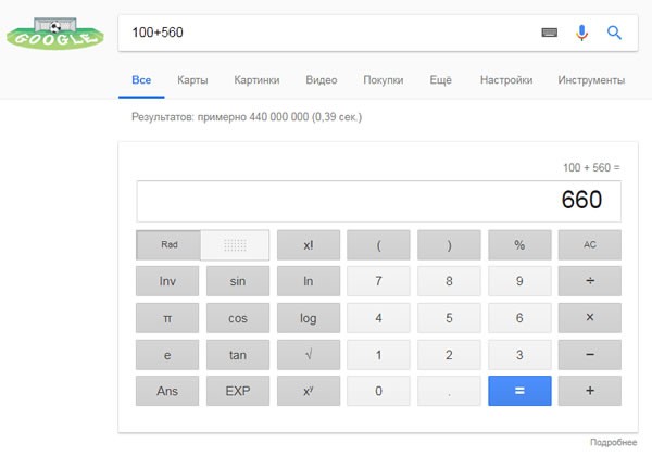 В поисковую строку можно ввести пример и Google отобразит результат уравнения.