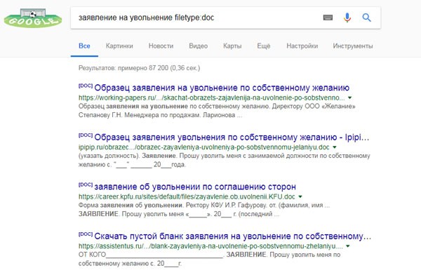 Например, запрос заявление на увольнение filetype:doc.