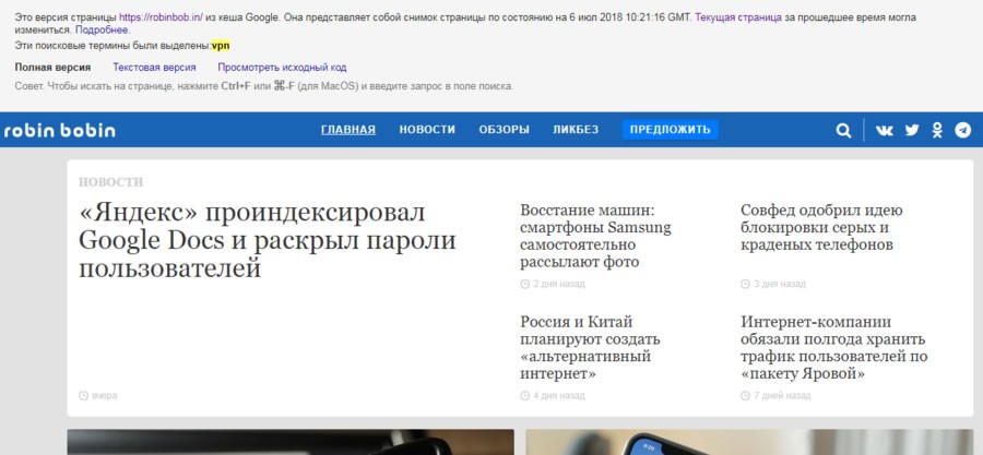 Например, запрос cache:robinbob.in vpn.