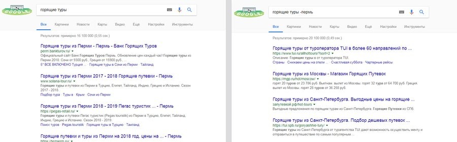 Например, запрос горящие туры -пермь.