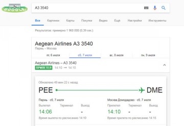 Если в поисковую строку ввести номер авиакомпании и самолета в Google, он сообщит вам информацию о рейсе, его статус и другую полезную информацию.
