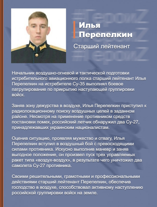 Старший лейтенант Илья Перепелкин совершил подвиг в ходе спецоперации на Украине. Он один уничтожил два украинских самолета Су-27.