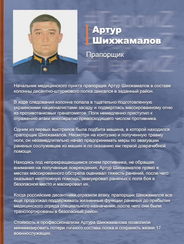 Прапорщик Артур Шихжамалов проявил смелость и мужество на поле боя и спас 17 раненных солдат. За свой героический поступок был удостоен государственной награды!