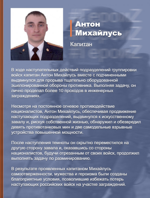 Начальник штаба понтонно-переправочного батальона капитан Антон Михайлусь - новый герой спецоперации на Украине. Рискуя жизнью, он обезвредил девять противотанковых мин и два самодельных взрывных устройства.