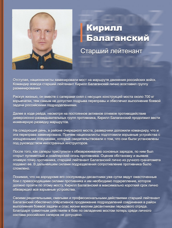 Командир взвода Кирилл Балаганский возглавил группу разминирования. Он и его товарищи под шквальным огнем смогли разминировать два моста.
