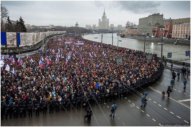 На марше памяти убитого политика Бориса Немцова в Москве раздавались выкрики «Слава Украине! Героям слава!», а также призывы освободить украинскую летчицу Надежду Савченко, обвиняемую в убийстве российских журналистов. Информация об этом распространилась в соцсетях. Фотографии людей с плакатами «Спасите Надежду Савченко» опубликованы в Twitter.