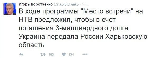 "В ходе программы "Место встречи" на НТВ предложил, чтобы в счет погашения 3-миллиардного долга Украина передала России Харьковскую область", - написал он в своем Твиттере.