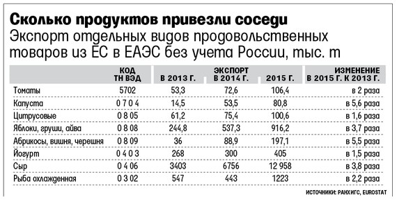 Полностью закрыть поступление продовольствия из стран, находящихся под эмбарго, оказалось невозможно, считают экономисты РАНХиГС. Они сопоставляют данные поставок некоторых видов овощей и фруктов в Россию и страны ЕАЭС с ростом их внутреннего потребления. Например, по данным Белстата, потребление овощей в 2015 г. в Белоруссии выросло всего на 300 г на человека в год, а потребление фруктов даже снизилось, и заметно, – на 4,5 кг на человека. Но если в 2013 г. около 700 000 т яблок в Россию поступило из Польши, то в 2015 г. примерно столько же поступило из Белоруссии, приводят экономисты данные Белстата.