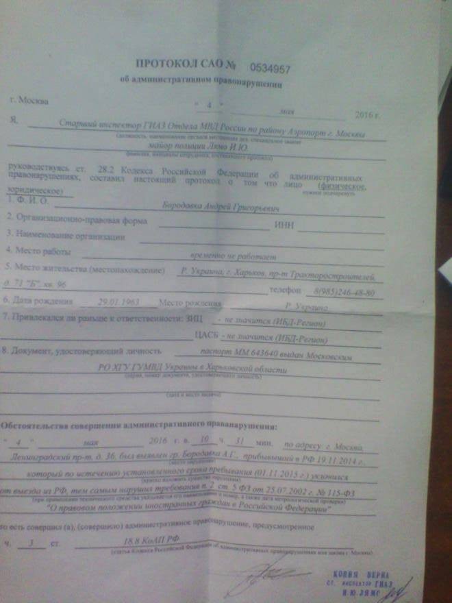 А 4.05.2016 инспектором ГИАЗ УВД Москвы по району Аэропорт был составлен акт об административном правонарушении. И Бородавка был задержан, а дело по факту нарушения ст. 18.8 КоАП РФ было передано в суд.