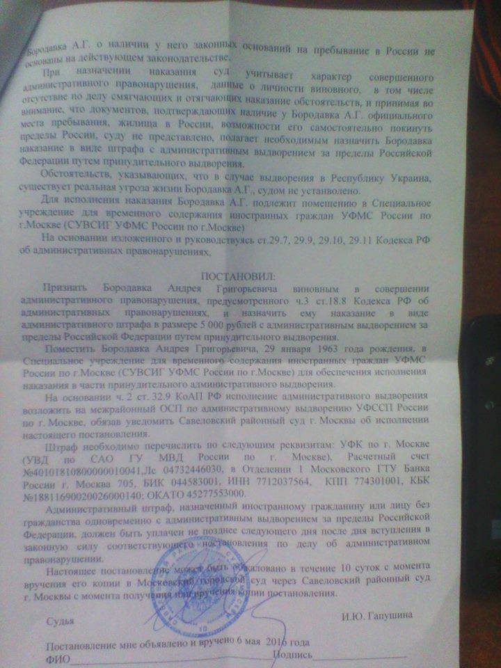Ситуация, нешуточно всколыхнувшая интернет-пространство по обе стороны российско-украинской границы. Действительно, такое происходит не каждый день. И, так как разные стороны по-разному трактуют происходящее, для читателей я решил сделать нечто вроде экспресс-анализа, состоящего из двух частей. Первая посвящается Андрею Бородавке как виновнику шума, вторая — нашей отечественной системе правосудия.Итак, решением Свердловского районного суда города Москвы от 6 мая 2016 года украинский журналист Андрей Бородавка был признан виновным в нарушении сроков пребывания в Российской Федерации. Бородавка был приговорён к штрафу в размере 5 тысяч рублей, но, что гораздо более важно, к депортации обратно на Украину.