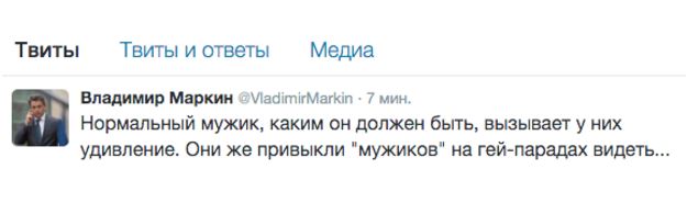 — Нормальный мужик, каким он должен быть, вызывает у них удивление. Они же привыкли "мужиков" на гей-парадах видеть, — написал Маркин в своём микроблоге в соцсети Twitter.