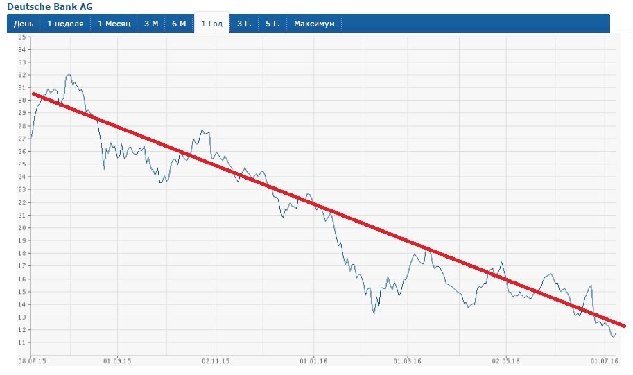 Стоимость акций «Deutsche Bank» закономерно продолжает снижаться. Если продолжить линию тренда (на графике красным), то можно предположить, что падение до нулевой отметки произойдёт в ближайшие несколько месяцев.