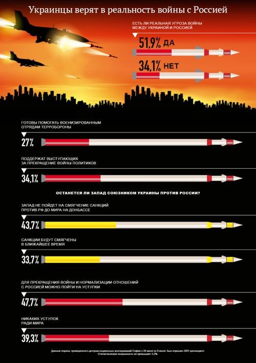 Но участвовать в этом конфликте согласились всего 27% опрошенных — и это при условии, что вопрос стоял только об оказании помощи отрядам территориальной обороны. О непосредственном участии, очевидно даже спрашивать побоялись. Если кто сомневается, то опрос совсем свежий – проводился с 29 июня по 8 июля 2016 года.