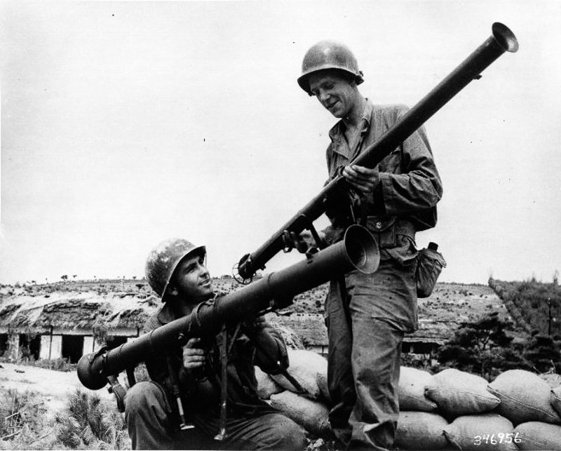 Динамореактивный ручной противотанковый гранатомет американского производства «Базука» поступил на вооружение американской армии в 1942 году. Оружие подвергалось серьезной критике за низкую мощность заряда, яркую вспышку, демаскирующую огневую позицию, и струю раскаленных газов, которая била прямо в лицо стрелка.