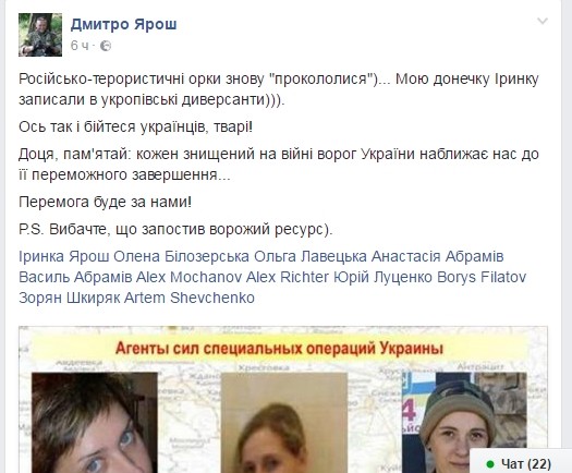 Есть информация, что после объявления в розыск украинских проституток-диверсанток где-то в Киеве и в Днепропетровске конкретно так «подгорело». Потому как в неустановленной временно личности там была опознана … дочь украинского фашиста Дмитрия Яроша – Ирина Ярош.