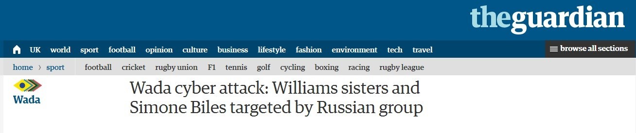 Статья вышла под заголовком не менее громким, чем само это заявление: «Кибератака на WADA: сёстры Уильямс и Симона Байлз атакованы российской группой».