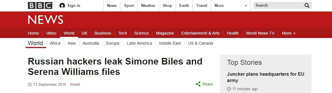 В том же ключе тему утечки информации освещает и BBC News: «Русские хакеры украли документы Симоны Байлз и Серены Уильямс».