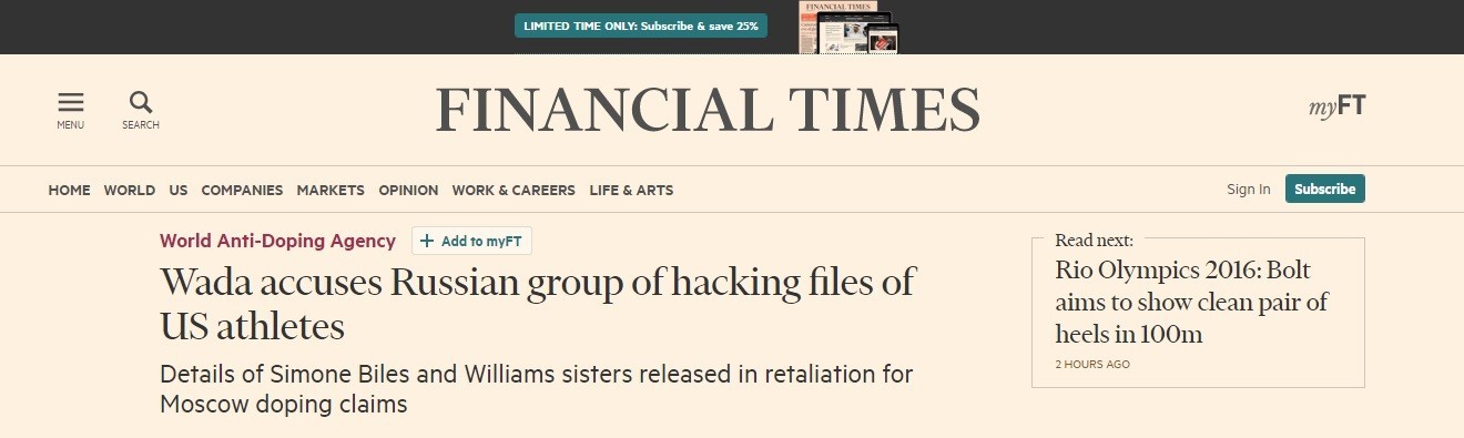 «WADA обвинила русскую группировку в публикации документов американских спортсменов», — пишет FT. Однако и в этом материале не приводится доказательств обвинений со стороны гендиректора WADA Оливье Ниггли в адрес России.