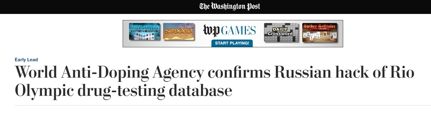 А газета The Washington Post слова о причастности России ко взлому приписывает самому руководству WADA, заявляя в заголовке: «Всемирное антидопинговое агентство подтвердило взлом русскими олимпийской базы данных по допингу». Попутно в издании утверждают, что Fancy Bear — это часть ГРУ.