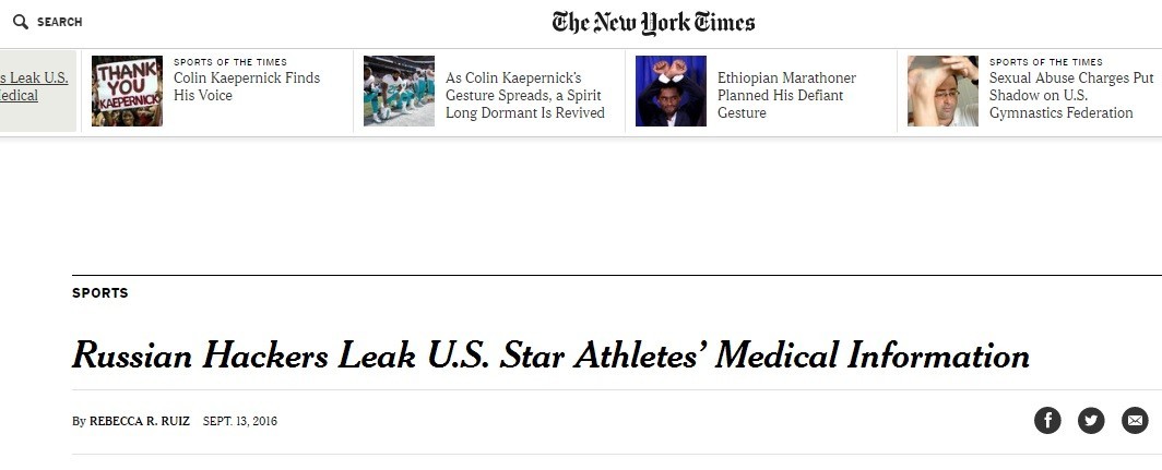 «Русские хакеры украли медицинскую информацию звёздных спортсменок США», — гласит заголовок.