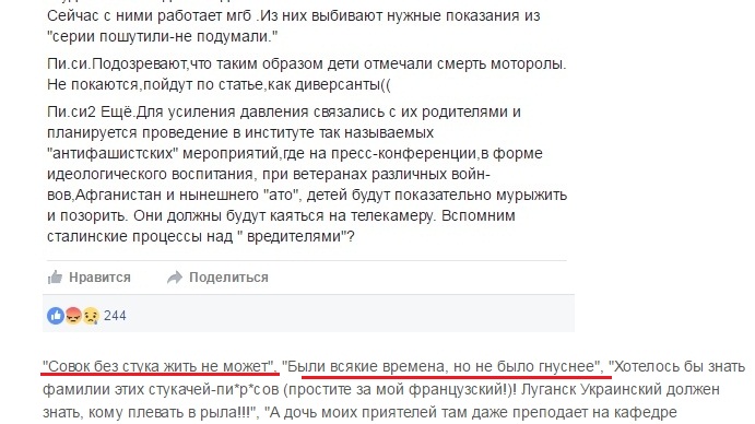 Тут украинское издание «Апостроф» внезапно разрыдалось об ужасах тоталитаризма в ЛНР. Ужасы тоталитаризма заключаются в том, что три дебила-студента в общежитии, в котором к слову, семьи ополченцев проживают, начали завывать украинской гимнО и кричать СУХС. Что там произошло на самом деле, я не знаю, подозреваю что трое дурачков перебрали с алкоголем и могли прикалываться в контексте может быть, вполне антиукраинской беседы. Но то такое, полиция, которую соседи вызвали - выяснит.