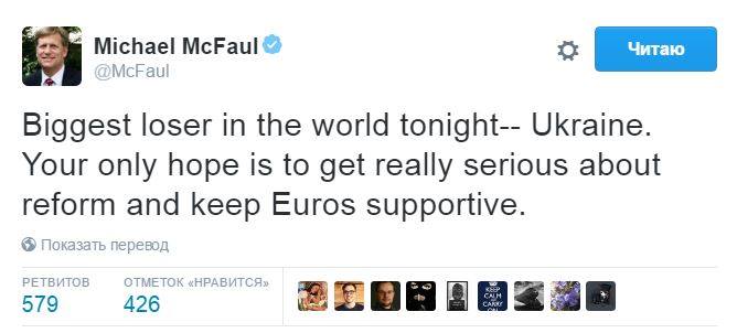 «Наибольший неудачник мира сегодня вечером — Украина. Вам теперь остается надеяться только на действительно серьезные реформы и поддержку европейцев», — написал американский дипломат.