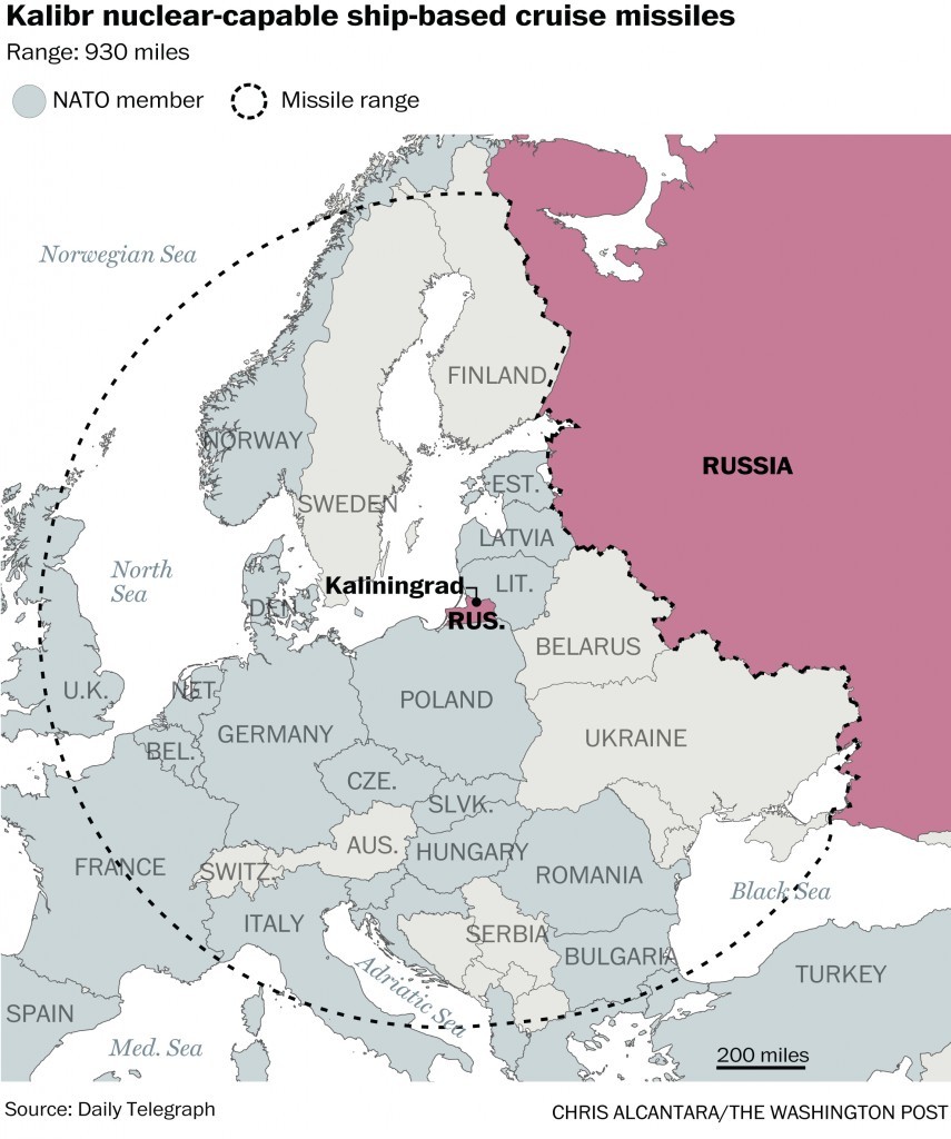 Ракетный комплекс морского базирования «Калибр НК». В октябре Москва отправила к берегам Калининграда два ракетных фрегата, оснащенных этими системами, и испытала их в сирийском конфликте. Радиус действия ракет этого комплекса, которые могут быть оснащены ядерными боеголовками, превышает 900 миль. На предоставленном изданием изображении видно, что они могут достичь стран Скандинавии, Центральной, Восточной и большей части Западной Европы.