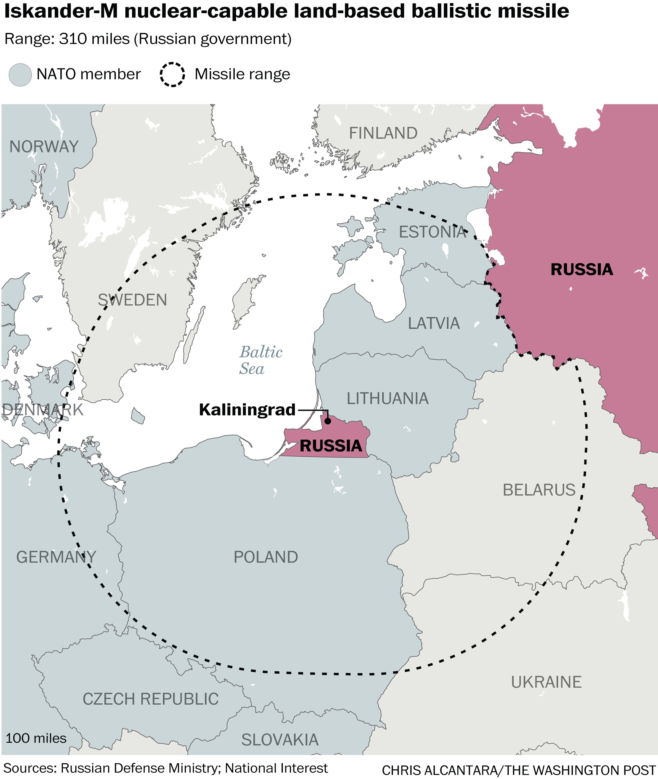 В своей статье американская газета делает обзор техники, которую Россия разместила в Калининграде, и демонстрирует карты со странами, которых должно встревожить развертывание российского оружия.