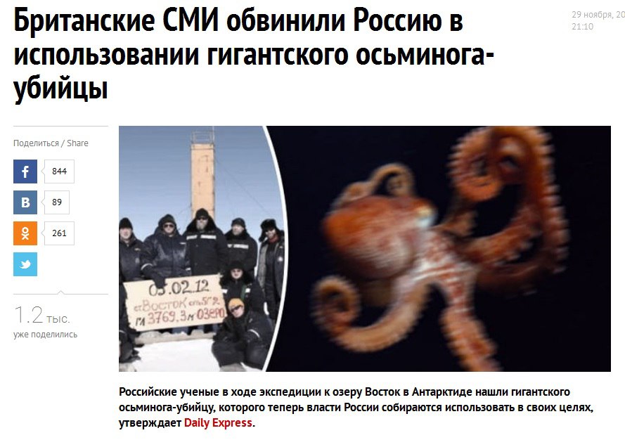Сегодня британские ученые подтвердили выкладки брайтонской интеллигенции, опубликовав сенсационные разоблачения о гигантских осьминогах на службе Черноморского флота РФ. Демократический журналист Саша Сотник также вспомнил, как по воспоминаниям знакомых таксистов терран Влад Путин иногда кричал в телефонную трубку «Выпускай кракена!», но тогда не придал этому значения. Теперь же пазл сложился. Огромный осьминог способен сковать движение целого корабля и выпускать ядовитое облако дальностью до двухсот метров. Думается, именно с этими морскими прислужниками Орды связаны внезапные поломки новейшего американского эсминца Зумвальт и британского эсминца, следившего за имперским корытом «Кузнецов». Ведь это самая совершенная техника, а не ржавая советская рухлядь. Она в принципе не ломается! Экологический активист Павел Шехтман уже по секрету сообщил (со слов знакомого в штабе Северного флота Мордора), что эскадру во главе с Кузнецовым сопровождают два отдельных дивизиона кракенов. Диктатор Влад Путин незаконно использует паноморальные явления! Не забываем о лейб-эскадроне черных магов, которые посменно обороняют Кремль от вторжения воинов света и разгневанных горожан.