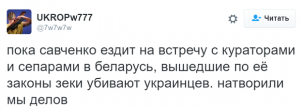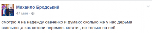 «Смотрю я на Надежду Савченко и думаю: сколько же у нас д*рьма всплыло, а как хотели перемен. Кстати, не только на неё», - прокомментировал глава глава Федерации баскетбола Украины Михаил Бродский в Facebook.