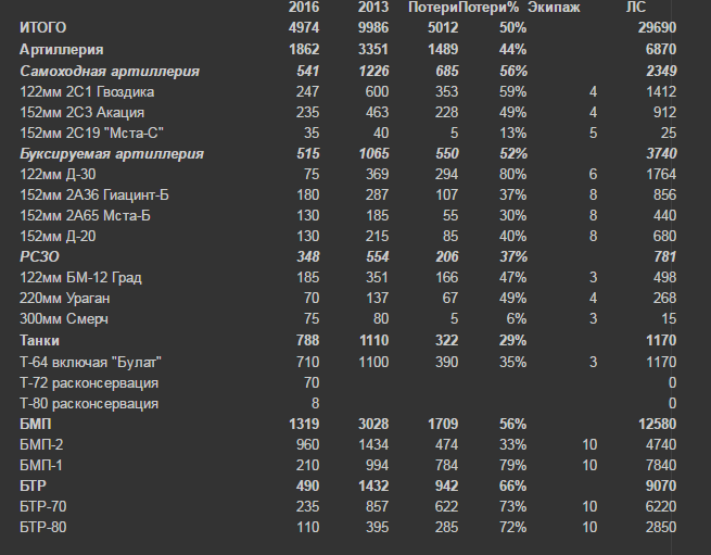 Именно эта разница в подходах в конечном итоге и привела к тотальному выбиванию материальной части артиллерии ВСУ. К слову сказать, всех видов, а не только одних лишь гаубиц Д-30. Вот тут можно посмотреть общую картину. Разница между состоянием на 2013 год и на конец 2016 говорит сама за себя. Хорошо видно, чем активнее использовалась система, чем ближе она находилась к линии фронта, тем выше процент ее потерь.