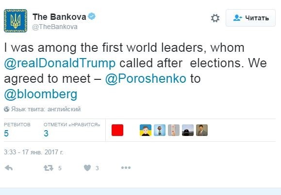 «Я был одним из первых мировых лидеров, которому позвонил Дональд Трамп после выборов. Достигнуто соглашение встретиться», - пишет Порошенко в своем Twitter.