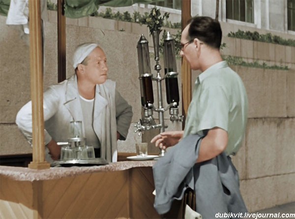 Автоматы разливали воду двух типов: простую газировку и газводу с сиропом. За одну копейку автомат наливал простую газированную воду, а за три — сладкую