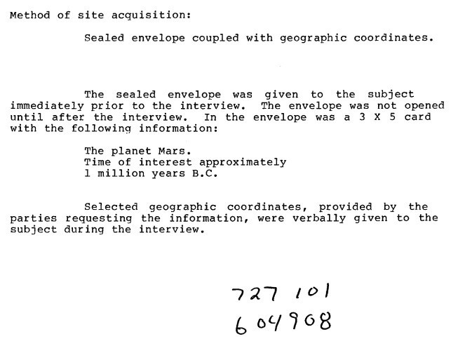 В архивах ЦРУ содержится более 13 миллионов страниц документов, у которых истёк срок секретности. Кроме стандартных аналитических справок и отчётов о деятельности во времена Корейской и Вьетнамской войн, в них обнаружились и неожиданные материалы. В частности, ЦРУ США в 1988 году прибегло к весьма необычным методам для того, чтобы разведать обстановку на Марсе.