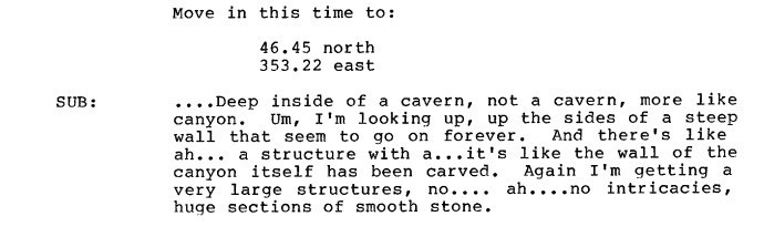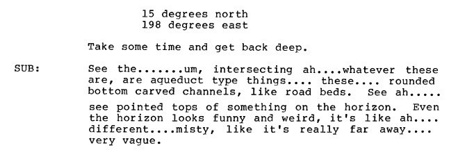 На координатах 15 градусов северной широты и 198 градусов восточной долготы он фиксирует: «Очень интересная штука, похоже на акведуки, такие каналы с закруглённым дном. На горизонте вижу остроконечные шпили. Сам горизонт какой-то странный, всё как в тумане», — сообщает подопытный.